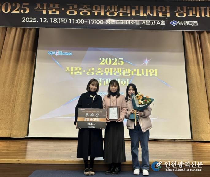 [인천광역신문] 박진 기자 | 상주시는 12월 18일 더케이 호텔 경주에서 개최된 녩년 식품·공중위생관리사업 성과대회’에서 우수상을 수상했다. 이번 수상은 경상북도가 실시한 2025년도 식품안전관리 시군 평가에서 식품안전관리 우수사례, 식생활 환경 개선관리, 정책협조도 등 평가지표 14개 항목에 대한 평가를 거쳐 우수기관으로 선정된 데 따른 것이다.