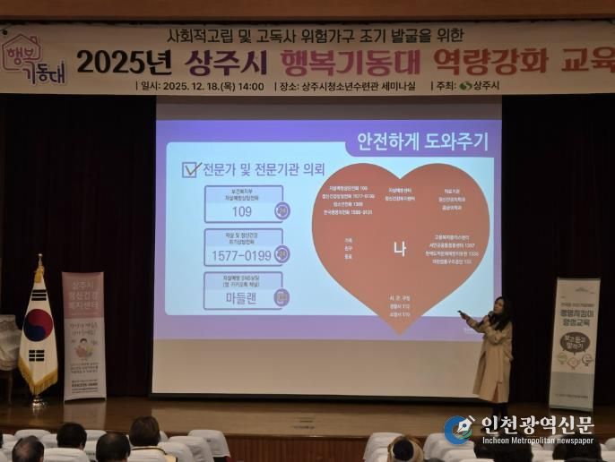 [인천광역신문] 박진 기자 | 상주시는 12월 18일 상주시청소년수련관 세미나실에서 읍면동 행복기동대원 150여 명이 참석한 가운데 2025년 행복기동대 역량강화 교육을 실시했다.