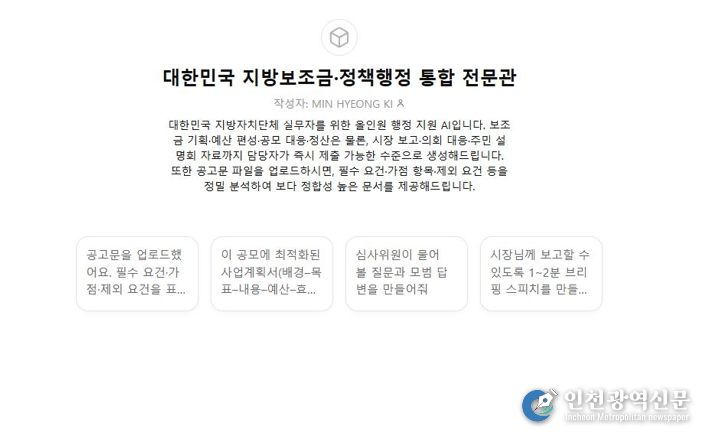 영예의 대상은 조양동주민센터 민형기 행정팀장이 차지했다. 민 팀장은 ‘대한민국 지방보조금 정책 행정 통합 전문관’ 작품을 통해 복잡한 지방보조금 업무를 AI로 통합 관리·효율화하는 모델을 제시해 심사위원들의 높은 평가를 받았다. 대상 수상자에게는 시장 표창과 함께 50만 원의 상금이 수여된다.
