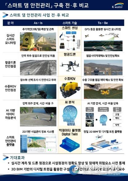 또한, 항공 및 수중 무인기를 활용하여 사람이 접근하기 어려운 댐체 고지, 수중의 수로터널, 여수로 등의 시설물에 대해 사각지대 없는 안전점검을 실시한다. 아울러 인공지능(AI)을 활용하여 무인기로 촬영한 영상에서 댐체의 손상부분을 자동으로 검출한다.