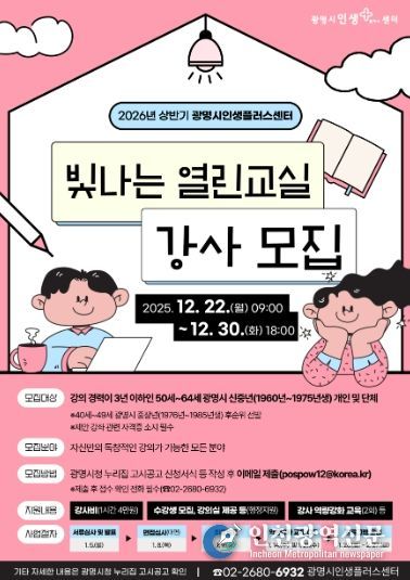 [인천광역신문] 박진 기자 | 광명시는 오는 30일까지 ‘2026년 상반기 빛나는 열린교실’에 참여할 신중년 아마추어 강사를 모집한다.