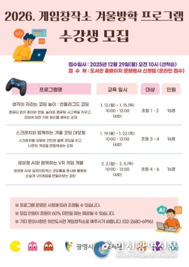 [인천광역신문] 박진 기자 | 광명시 게임창작소는 오는 29일 오전 10시부터 겨울방학 프로그램 수강생을 모집한다.