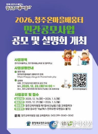 [인천광역신문] 박진 기자 | 청주교육지원청과 청주시는 지역사회와 함께하는 배움 공동체 조성을 위해 청주온마을배움터 민간공모사업 참여 단체를 모집한다고 밝혔다.