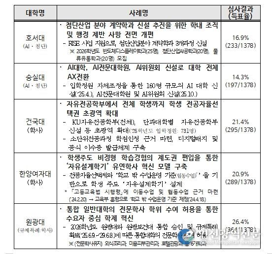 올해에는 '고등교육법 시행령'과 '대학설립·운영 규정' 개정 등 그간의 규제 개선* 내용을 토대로, 첨단 분야 계약학과 및 입학 정원 증원 등을 활용한 첨단 분야 학과 신설, 소단위 전공 과정과 연계한 전공자율선택제 확대 등 다양한 대학 혁신 사례들이 응모됐다. 1단계 전문가 평가 후 일반 국민들의 체감도를 반영하기 위한 2단계 온라인 국민심사(12.8~12.10., 소통24 온라인 투표)를 실시하여, 최종 5개 대학을 선정했다.