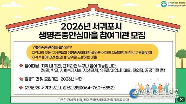 [인천광역신문] 박진 기자 | 서귀포보건소는 2026년 생명존중안심마을에 새롭게 함께할 참여기관을 모집한다고 밝혔다. 생명존중안심마을은 마을별 생명존중 네트워크를 형성하는 핵심 사업으로, 보건의료․교육․사회복지․지역사회․공공기관의 5가지 영역별 참여기관이 함께하며 마을 내 생명존중 문화 조성을 위해 협력하는 사업이다.