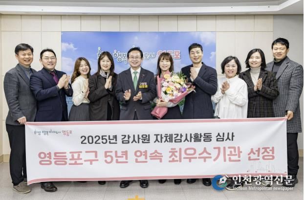 [인천광역신문] 박진 기자 | 영등포구가 감사원 주관 ‘2025년 자체 감사활동 심사’에서 최고 등급인 A등급을 받아 ‘5년 연속’ 최우수기관으로 선정되며 감사원 기관 표창을 수상했다고 밝혔다. 이는 전국 지방자치단체 가운데 유일한 사례로, 구의 체계적이고 선도적인 자체 감사 운영 역량을 다시 한번 입증했다.