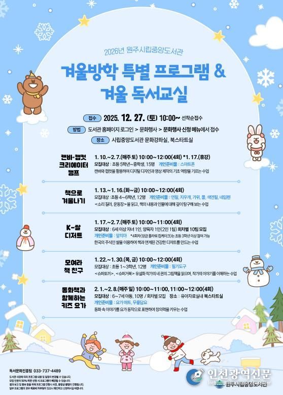 [인천광역신문] 박진 기자 | 원주시립중앙도서관은 겨울방학을 맞아 유아부터 청소년을 대상으로 겨울방학 특별 프로그램과 겨울 독서교실을 운영한다.