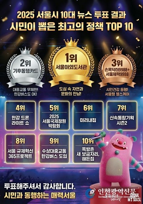 울시는 12월 19일까지 진행한 ‘2025 서울시 10대 뉴스’ 투표에서 ‘서울야외도서관’이 11만 2762표(17.1%)로 1위를 차지했다고 밝혔다. 2위는 ‘기후동행카드(11만927표, 16.9%)’, 3위는 ‘손목닥터9988+서울체력9988(8만9845건, 13.7%)’ 였다.