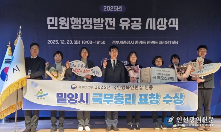 [인천광역신문] 박진 기자 | 밀양시는 23일 정부세종청사에서 열린 ‘2025년 민원행정발전 유공 시상식’에서 국민행복민원실 우수기관으로 선정돼 국무총리 표창을 수상했다.