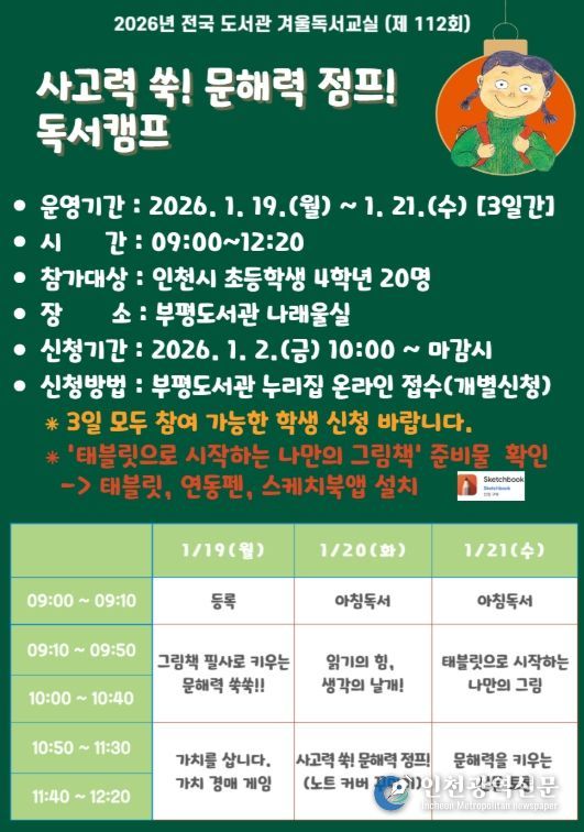 [인천광역신문] 박진 기자 | 인천광역시교육청부평도서관은 2026년 1월 19일부터 21일까지 초등학교 4학년 20명을 대상으로 겨울독서교실 ‘사고력 쑥! 문해력 점프! 독서캠프’를 운영한다.