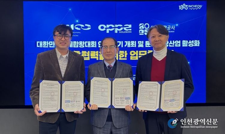 [인천광역신문] 박진 기자 | 인천관광공사(사장 유지상)와 대한민국국제합창대회 조직위원회(위원장 김희철), ㈜놀던오빠들(대표 김준호)은 26일 인천관광공사에서 ‘대한민국국제합창대회 인천 개최(2026년~2030년) 및 문화관광 활성화’를 위한 업무협약을 체결했다.