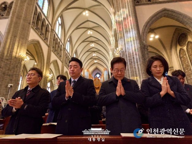 [인천광역신문] 박진 기자 | 이재명 대통령과 김혜경 여사가 25일 서울 중구 명동대성당에서 열린 성탄 대축일 미사에서 기도를 하고 있다.