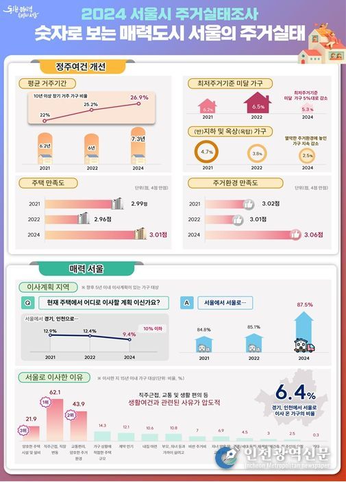 [인천광역신문] 박진 기자 | 최근 4년간 서울시민의 평균 거주기간이 6.2년에서 7.3년으로 늘어나 주거 안정성이 높아진 것으로 나타났다. 주택 만족도(3.01점)와 주거환경 만족도(3.06점)도 4점만점 기준 모두 상승해, 서울의 전반적인 정주여건이 개선되고 있는 것으로 분석됐다.