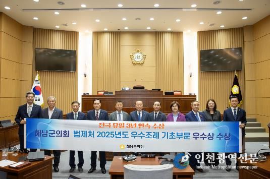 [인천광역신문] 박진 기자 | 해남군의회는 18일 법제처가 주관한 '2025년 우수 자치입법 활동 지방정부 선정' 기초지방자치단체 부문에서 우수상을 수상했다.
