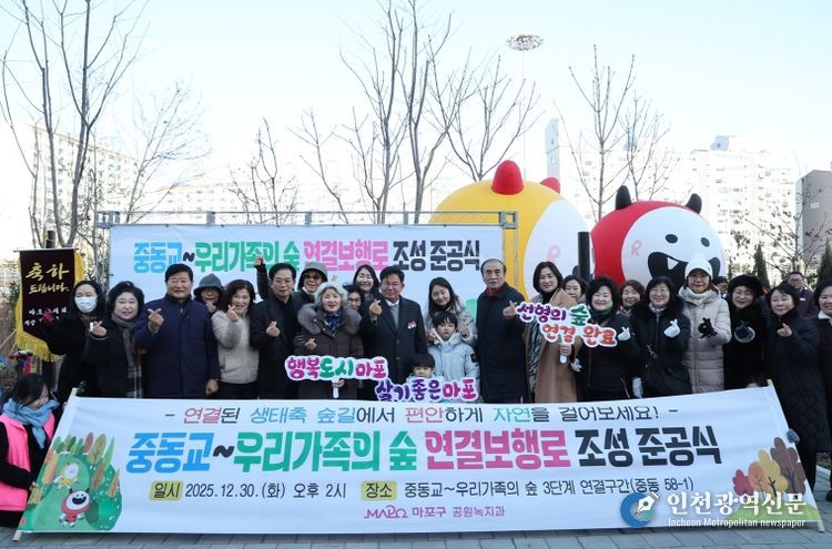 [인천광역신문] 박진 기자 | 박강수 마포구청장은 12월 30일 오후 2시, 중동교와 우리가족의 숲(구 선형의 숲) 3단계를 잇는 구간에서 열린 ‘중동교~우리가족의 숲 연결보행로 조성사업 준공식’에 참석했다.