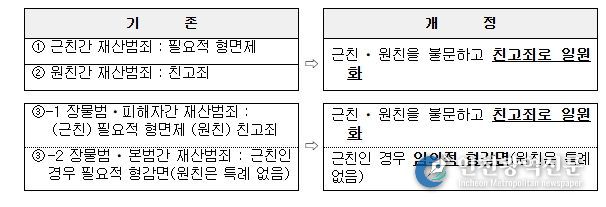 이번 「형법」 개정안에 따르면, ① 친족의 범위를 불문하고 친족간 재산 범죄는 친고죄로 일치시켜 규정하고, ② 장물범과 본범(예:절도범 등) 사이가 근친인 경우 현행 ‘필요적 감면’에서 ‘임의적 감면’으로 개정하며, ③ 근친・ 원친 여부를 불문하고 친고죄로 개정됨에 따라 「형사소송법」 및 「군사법원법」상 고소 제한 규정의 특례를 마련하여 자기・배우자의 직계존속에 대하여도 고소를 할 수 있도록 했다.