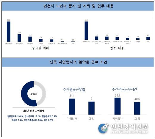 인천시민 60~80세 노인 대상 설문조사 결과, 60.1%의 노인이 어떠한 형태로든 경제활동에 참여하고 있었으며, 그중 52.6%는 단독 자영업자로 이들은 주간 근무일(평균 6.1일) 및 주간 근무시간(평균 54.7시간)이 다른 근로 형태에 비해 길어 상대적으로 열악한 노동환경에서 일하고 있었다.