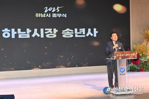 [인천광역신문] 박진 기자 | 하남시는 31일 시청 대강당에서 전 직원이 참석한 가운데 2025년 종무식을 개최하고, 한 해 동안의 성과를 돌아보며 2026년 시정 운영 방향을 공유했다. 이날 종무식은 2025년 시정 주요 성과를 담은 영상 상영을 시작으로, 시장 송년사, K-pop 댄스 챌린지 공연, 유공자 표창 수여 순으로 진행됐다.