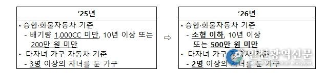 2026년부터는 소형 이하이면서 10년 이상 또는 500만 원 미만인 승합·화물차도 일반재산 환산율이 적용되고, 2명 이상의 자녀가 있으면 다자녀 가구로 인정된다.
