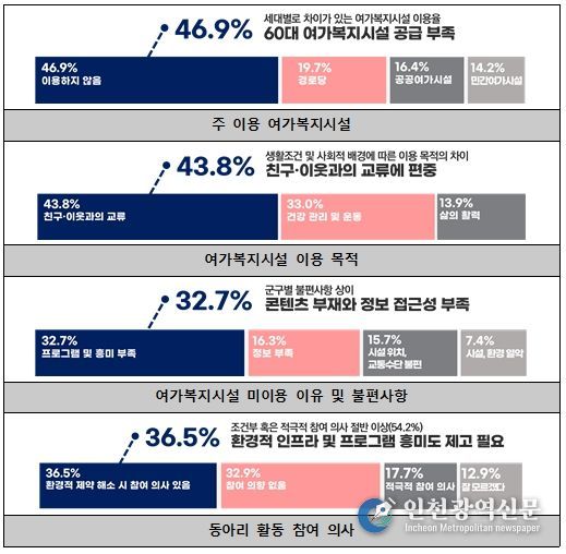연구 결과, 인천시는 60대 이상 고령인구가 빠르게 증가하고 있으나, 고령자의 사회참여와 평생학습을 지원하는 여가복지시설과 프로그램 공급은 수요에 비해 충분하지 않은 것으로 나타났다.