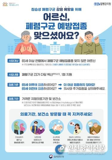 [인천광역신문] 박진 기자 | 영도구보건소는 폐렴으로 인한 중증 합병증을 예방하기 위해 만 65세 이상 어르신을 대상으로 폐렴구균 무료 예방접종을 상시 실시하고 있다.