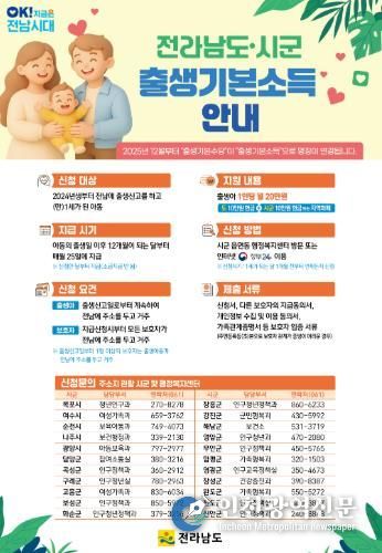 [인천광역신문] 박진 기자 | 전라남도는 2024년생에 이어 전남에서 태어난 2025년생 출생아에게 전라남도–시군 출생기본소득을 지급한다.
