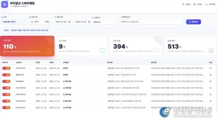 [인천광역신문] 박진 기자 | 서울 강동구는 인공지능(AI) 모델을 활용한 ‘바이브 코딩(Vibe Coding)’ 기법으로 자치법규와 상위법령을 실시간 자동 매칭하는 ‘강동 자치법규 스마트 매칭’ 시스템을 자체 개발해 올해 1월부터 운영한다고 6일 밝혔다.