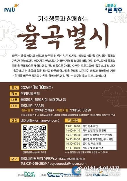 [인천광역신문] 박진 기자 | 파주시환경센터 에코온은 파주를 대표하는 조선시대 사상가 율곡 이이의 학문 정신을 현대적 기후행동 가치로 재해석한 기후문화축제 ‘기후행동과 함께하는 율곡별시’를 오는 10일 운정행복센터에서 개최한다고 밝혔다.