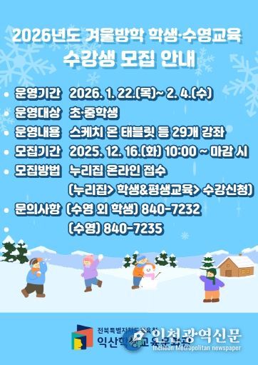 [인천광역신문] 박진 기자 | 익산학생교육문화관은 오는 22일부터 초등학생 및 중학생을 대상으로 방학중 학생 특기적성교육 프로그램을 2주간 운영한다고 밝혔다.