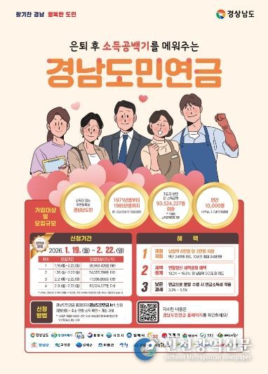 [인천광역신문] 박진 기자 | 창녕군은 군민의 소득 공백기 해소와 안정적인 노후 준비를 지원하기 위한 ‘경남도민연금’ 가입자 130명을 목표로 오는 1월 19일부터 1차 모집을 시작한다고 밝혔다.