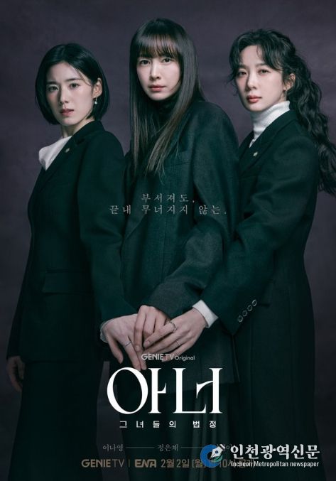 [인천광역신문] 박진 기자 | 지니 TV 오리지널 드라마 ‘아너 : 그녀들의 법정’ 이나영X정은채X이청아가 거대한 스캔들에 정면 돌파한다. 세 변호사의 ‘부서져도, 끝내 무너지지 않는’ 결연한 연대를 암시하는 메인 포스터가 전격 공개됐다.