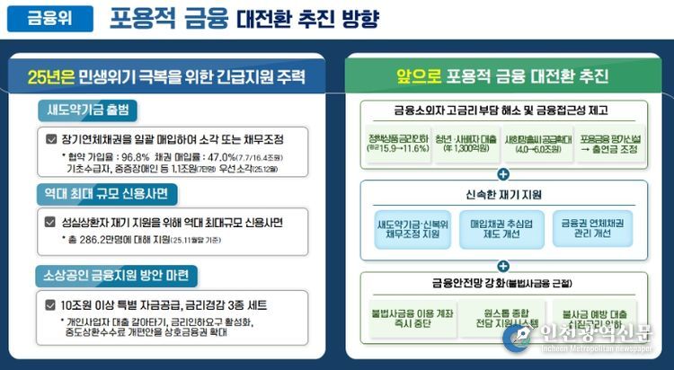 [인천광역신문] 박진 기자 | 2026년 1월 8일 금융위원회는 경기도 수원 서민금융통합지원센터에서 '포용적 금융 대전환' 1차 회의를 개최했다. 8일 회의는 정부·유관기관 뿐만 아니라 5대 금융지주와 포용금융 민간전문가도 참석하여 앞으로 정부와 민간이 함께 추진해 나가야할 포용금융 방향을 모색하는데 초점을 맞추었다.