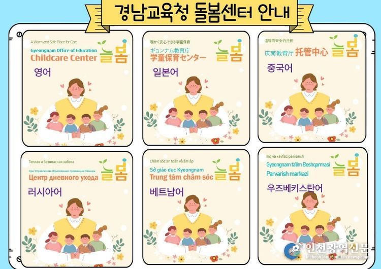 [인천광역신문] 박진 기자 | 경상남도교육청은 다문화 가정과 외국인 학부모가 돌봄 서비스를 쉽게 이해할 수 있도록 경남교육청 돌봄센터 ‘늘봄’ 안내자료를 6개 국어로 제작해 배포했다. 지원 언어는 영어, 일본어, 중국어, 베트남어, 러시아어, 우즈베키스탄어이다.