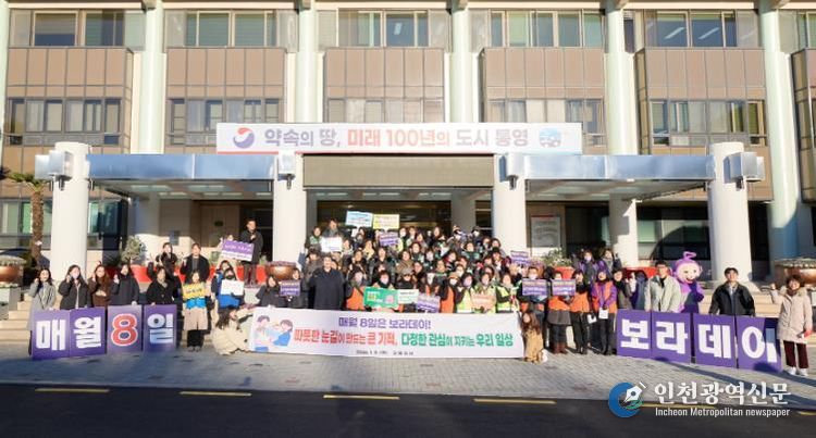 [인천광역신문] 박진 기자 | 통영시는 8일 병오년 첫 보라데이를 맞아 통영시 공직자를 대상으로 아동학대 및 4대 폭력 근절을 위한 인식개선 캠페인을 진행했다.
