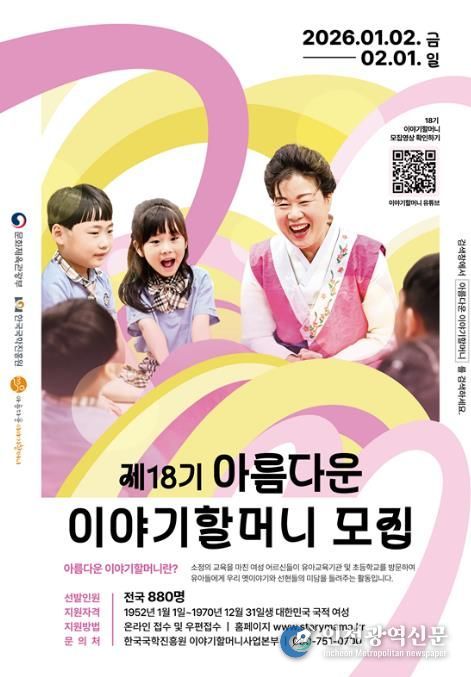 [인천광역신문] 박진 기자 | 세종특별자치시가 문화체육관광부·한국국학진흥원과 함께 내달 1일까지 유아들에게 재미와 감동이 있는 옛이야기를 들려줄 ‘제18기 아름다운 이야기할머니’를 공개 모집한다.