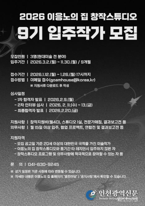 [인천광역신문] 박진 기자 | 홍성군 고암이응노생가기념관은 고암 이응노 화백의 예술 정신을 바탕으로 동시대 미술 창작을 지원하기 위해 이응노의 집 창작스튜디오 9기 입주작가를 공개 모집한다.