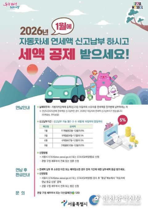 구로구 관계자는 “자동차세를 1월에 연납할 경우 가장 많은 세액 공제 혜택을 받을 수 있는 만큼, 구민 여러분의 많은 관심과 신청을 바란다”고 말했다.