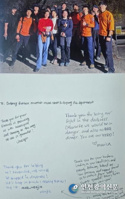 [인천광역신문] 박진 기자 | 경기도 구조대원의 활동으로 자칫 생명을 잃을 수도 있는 상황에서 위기를 넘긴 외국인 관광객이 감사 편지를 보낸 사실이 알려져 화제다. 화제의 주인공들은 고양소방서 산악구조대.
