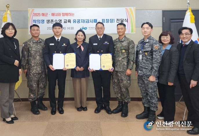 [인천광역신문] 박진 기자 | 서귀포시교육지원청은 8일 교육장실에서 전국 최초로 시행된 ‘해군·해녀 협업 생존수영 교육’의 성공적인 운영에 기여한 지역 인사와 군 관계자들에게 감사패와 표창장을 전달했다.