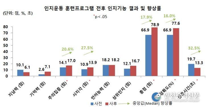 인지운동 훈련프로그램의 효과성 분석 결과, 참여 노인의 전체 인지기능 점수 중앙값은 17.9% 향상됐으며, 주의집중(20.6%), 시지각(27.5%), 정확도(16.0%), 반응시간(32.5%) 등 주요 인지 영역에서 통계적으로 유의미한 개선이 확인됐다. 또한 기억력 개선에서도 긍정적인 변화가 나타났다.