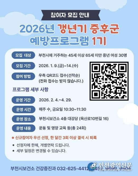 송정원 부천시보건소장은 “갱년기로 인한 신체적 변화와 정서적 어려움을 겪고 있는 중년 여성들이 이번 프로그램을 통해 건강한 일상을 회복하는 데 도움이 되길 바란다”며 “적극적인 참여를 기대한다”고 말했다.