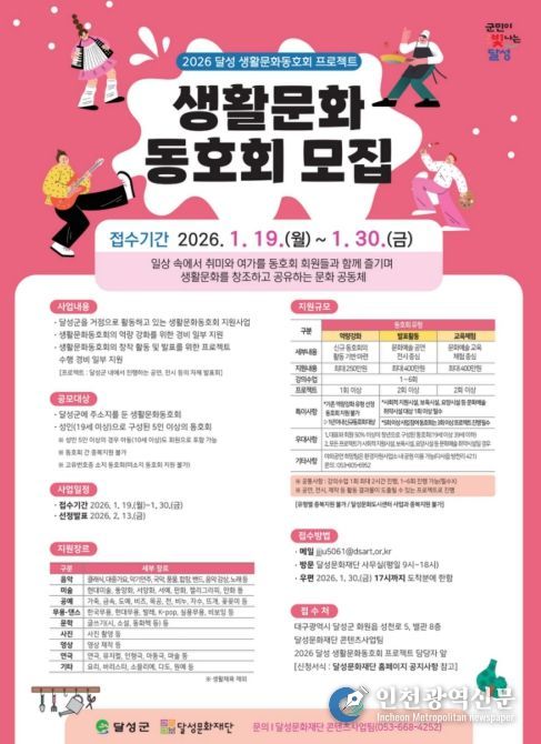 [인천광역신문] 박진 기자 | (재)달성문화재단은 1월 19일부터 30일까지 ‘2026 달성 생활문화동호회 프로젝트’에 참여할 동호회를 모집한다고 9일 밝혔다.