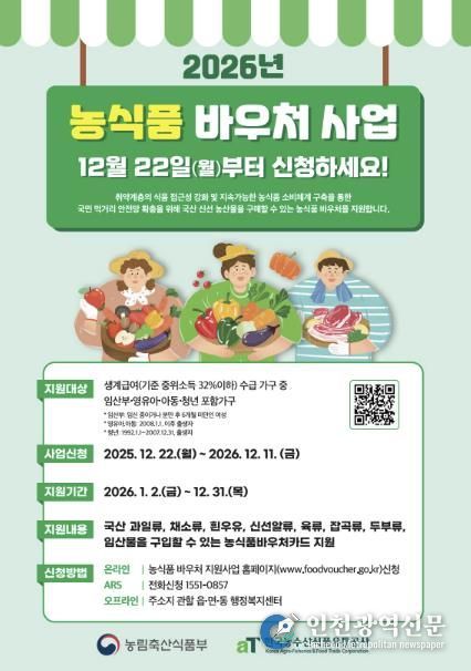 [인천광역신문] 박진 기자 | 진도군은 취약계층의 식생활 안정을 도모하고 지역 농산물의 소비를 촉진하기 위해 ‘2026년 농식품 바우처 사업’을 추진한다.
