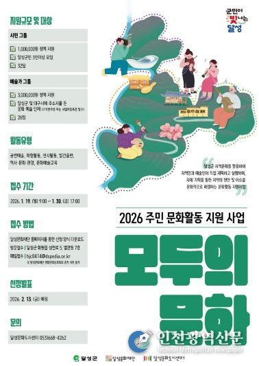 [인천광역신문] 박진 기자 | (재)달성문화재단 달성문화도시센터는 오는 30일까지 지역 주민과 예술가들의 문화활동 지원 사업 ‘모두의 문화’에 참여할 단체를 모집한다고 12일 밝혔다.