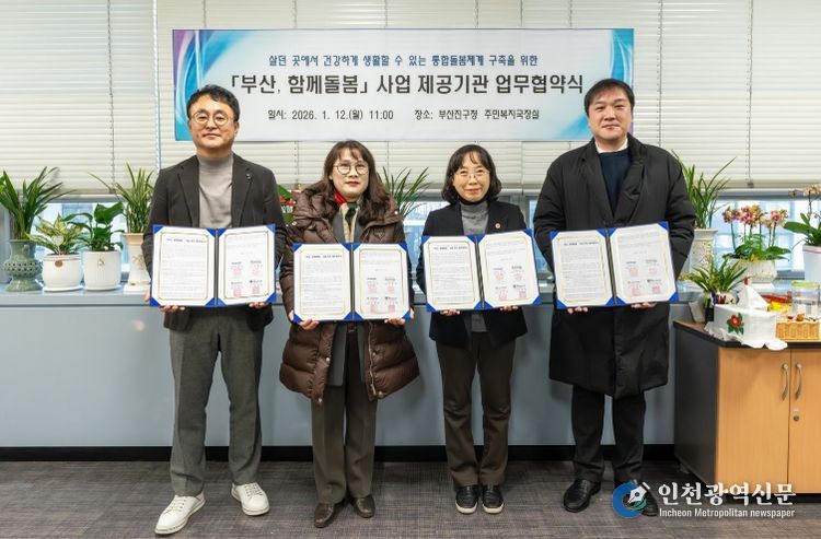 [인천광역신문] 박진 기자 | 부산 부산진구는 지난 12일 ▲부산진시니어클럽 ▲부산진지역자활센터 ▲한국치매돌봄협동조합과 ‘부산, 함께돌봄’ 사업의 상호협력체계 구축을 위한 업무협약을 체결했다.