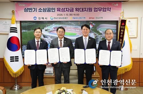 [인천광역신문] 박진 기자 | 김해시는 13일 김해시청에서 NH농협은행, BNK경남은행, 경남신용보증재단과 ‘2026년 상반기 소상공인 지원 업무협약(MOU)’을 체결했다.