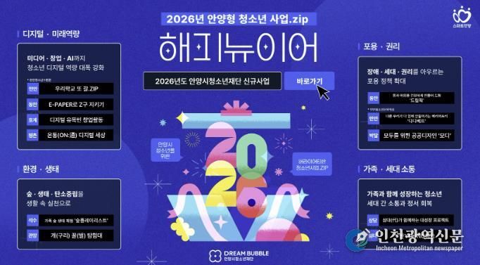 [인천광역신문] 박진 기자 | 안양시청소년재단은 2026년을 맞아 ‘청소년이 주도하는 변화의 물결, 모두가 함께하는 지속 가능한 미래’라는 비전 아래 10개 소속 기관을 주축으로 신규사업을 본격 추진한다.