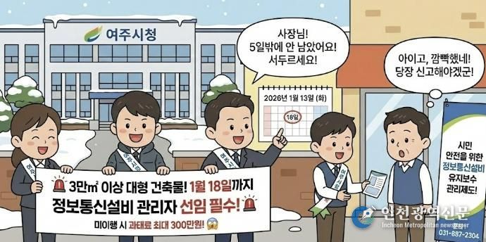 현재 여주시 내 연면적 3만㎡ 이상인 대형 건축물의 관리주체는 오는 2026년 1월 18일까지 정보통신설비 유지보수 관리자를 선임하고 지자체에 신고를 완료해야 합니다.