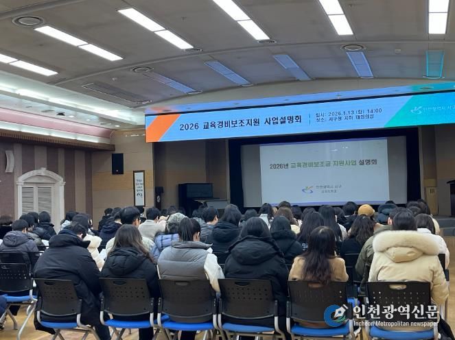 [인천광역신문] 박진 기자 | 인천광역시 서구는 2026년도 교육경비 보조지원 사업의 원활한 추진을 위해 관내 초·중·고·특수학교 교육경비사업 담당 실무자 84명이 참석한 가운데 ‘2026년 교육경비보조지원 사업설명회’를 개최했다.