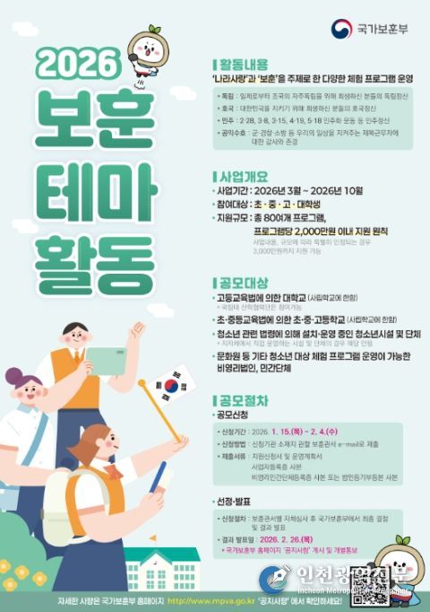 [인천광역신문] 박진 기자 | 국가보훈부는 전국의 청소년들이 일상에서 쉽고 재미있게 ‘보훈’을 체험하고 이해할 수 있도록 지원하기 위한 ‘2026년 청소년 보훈 테마활동’ 프로그램 공모를 15일부터 2월 4일까지 진행한다고 밝혔다.